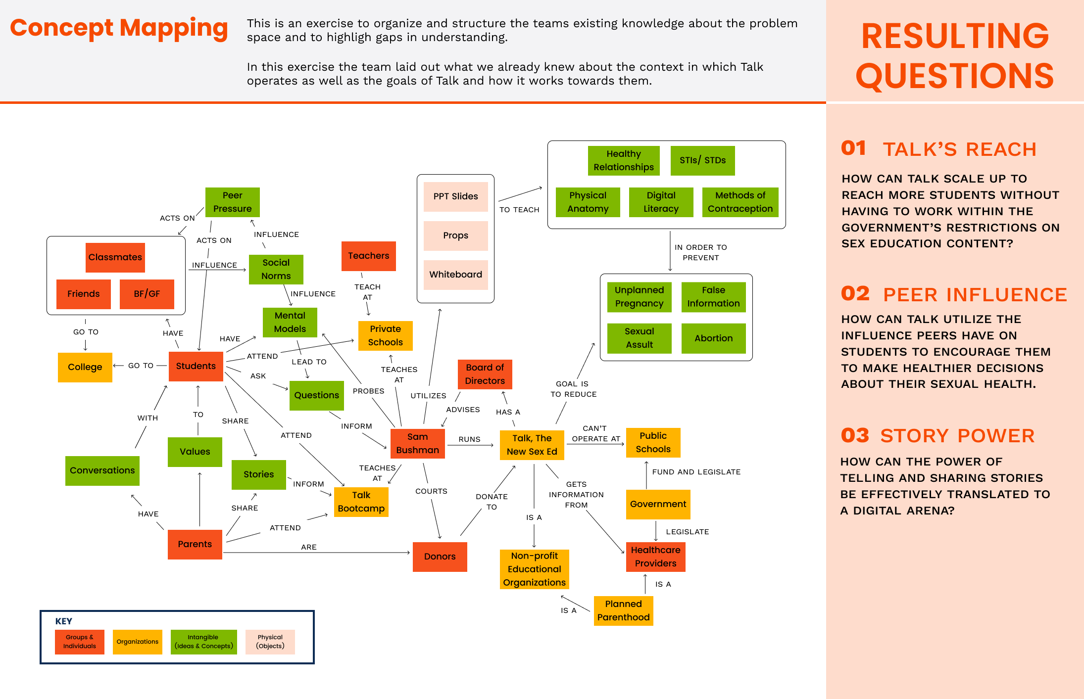 We created storyboards and "speed-dated" radical concepts to test for boundaries that individuals have around the space of sex education and identify opportunities.
