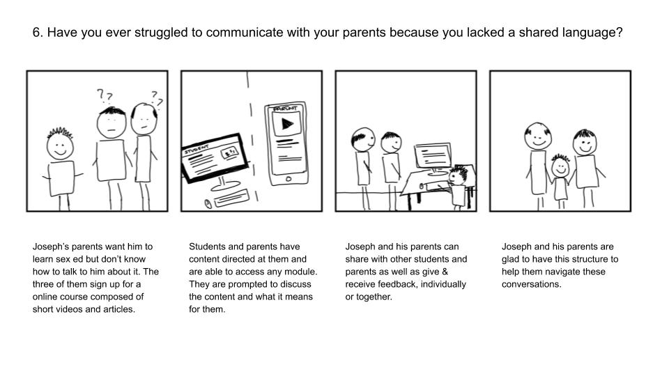 We created storyboards of possible delivery mechanisms that could teach Talk content. The goal of these storyboards was not to validate real solutions, but rather to gauge boundaries that individuals have around sex education. Some storyboards included a conversational user interface to mediate parent to child communication, a Tinder sex education certification badge, and traditional online learning mechanisms. We then speed dated these storyboards with a variety of participants, including parents and students. This allowed us to identify not only boundaries but also positive opportunities for the team.